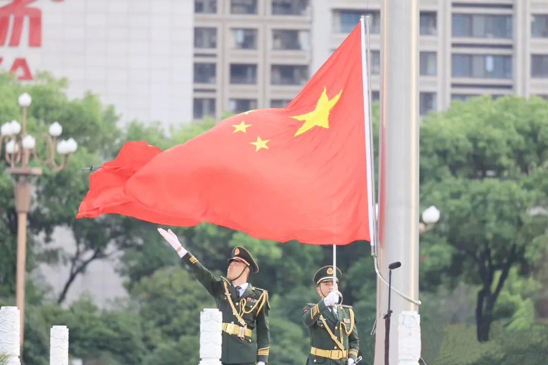 6点10分,在慷慨激昂的《中国人民解放军进行曲》中,英姿飒爽的国旗护卫队队员踢着坚实而雄健的步伐从候场区走过金水桥,精神抖擞地护送国旗走向升旗台。随后,雄壮的中华人民共和国国歌响起,升旗手振臂一挥,鲜艳的五星红旗冉冉升起。华泰建设全体员工满心激动,仰望国旗、高唱国歌,祝愿伟大祖国繁荣昌盛。