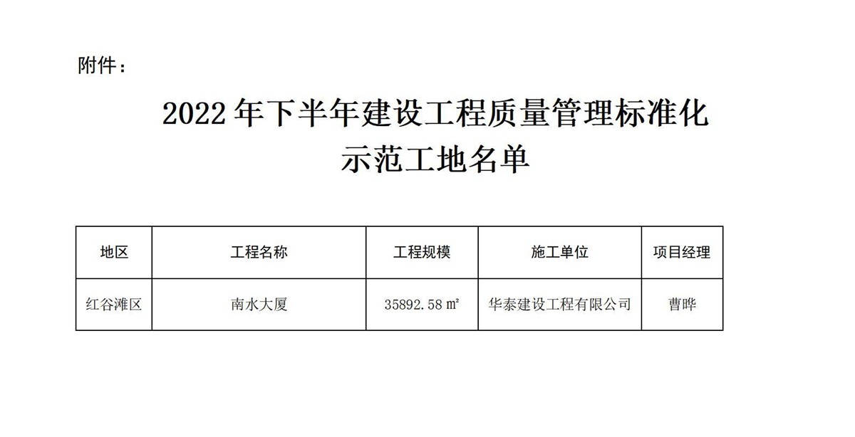近日,在南昌市住房和城乡建设局发布的《关于2022年下半年建设工程质量管理标准化示范工地的通告》、黄石市建筑业协会发布的《关于授予2022年度黄石市建设结构优质工程奖项目的通知》中,经各属地工程质量监督部门推荐和专家评价,由易游·体育(中国)官方网站,YIYOU SPORTS承建的“南水大厦”项目与“太阳城·檀悦府二标段1#、7#、8#楼”项目分别荣获南昌市“2022年下半年建设工程质量管理标准化示范工地”、“黄石市2022年度建设工程铜都杯(结构优质工程)奖”。建设工程质量标准化示范工地评比是考核参建单位质量管理水平的重要标准之一,同时,建设工程铜都杯(结构优质工程奖)代表了建筑工程结构施工质量的高水平,也是精品工程的重要标志。获此两项殊荣,是对华泰建设项目施工水平及安全质量管理的充分肯定,彰显了华泰建设在工程项目管理、工程品质等领域的卓越实力。