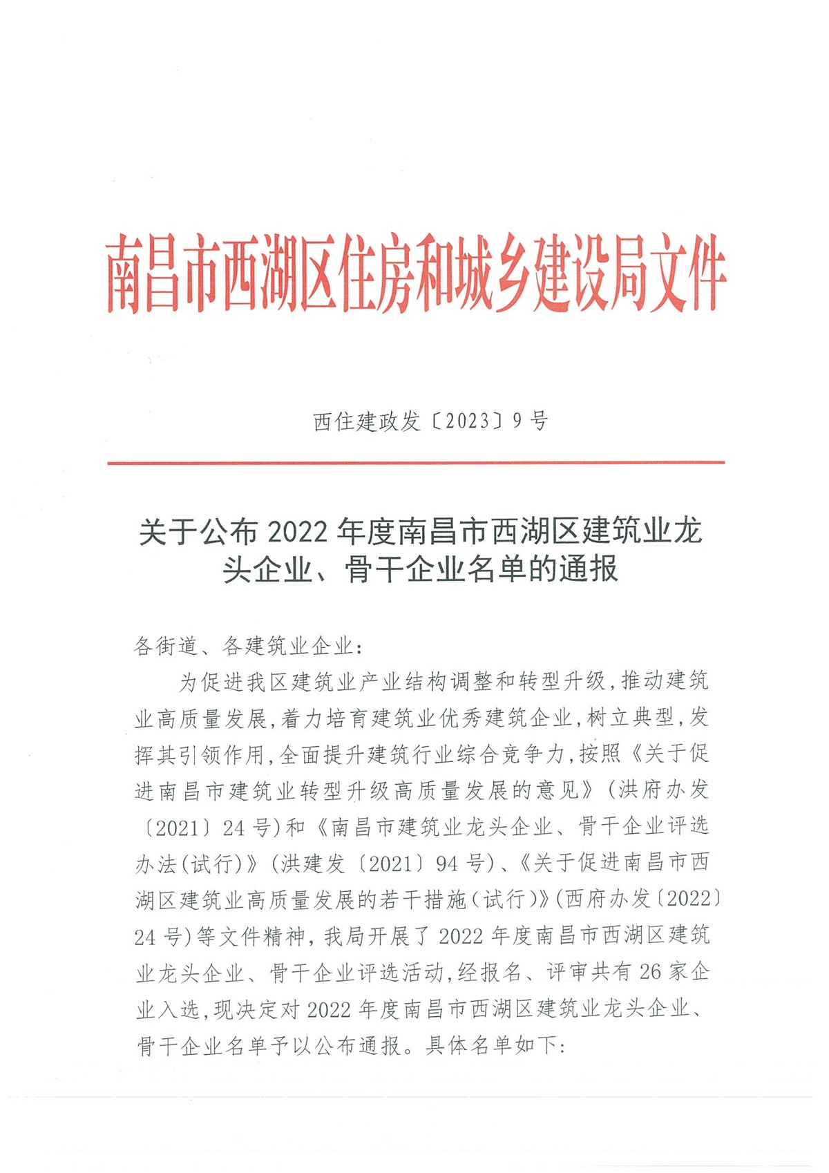 2023年2月21日,恰逢农历二月二龙抬头,在这个红红火火的日子,南昌市西湖区住房和城乡建设局发布了《关于公布2022年度南昌市西湖区建筑业龙头企业、骨干企业名单的通报》,经层层严格考评认定,易游·体育(中国)官方网站,YIYOU SPORTS凭借实干笃行与卓越品质获得“2022年度南昌市西湖区建筑业龙头企业”荣誉称号!这是继2023年1月获得“2022年度南昌市建筑业骨干企业”后的又一个荣誉认证。这不仅是对华泰建设的嘉奖与再次肯定,更是对华泰建设发展的激励与鞭策。