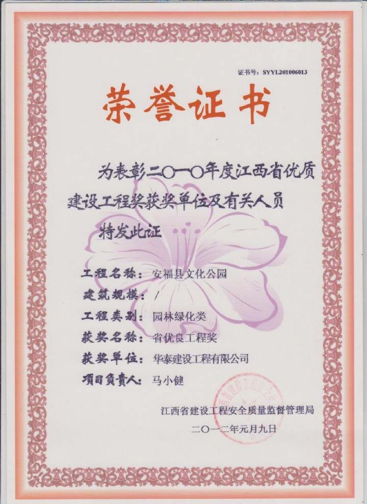 安福县文化公园荣获江西省优良工程奖