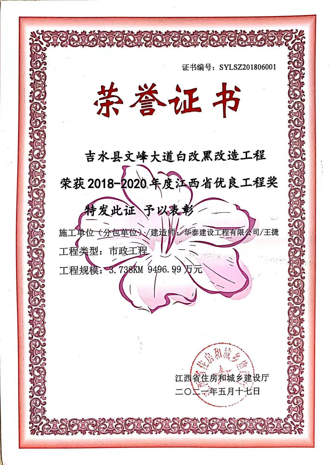 荣获2018-2020年度江西省优良工程奖 ——吉水县文峰大道白改黑改造工程