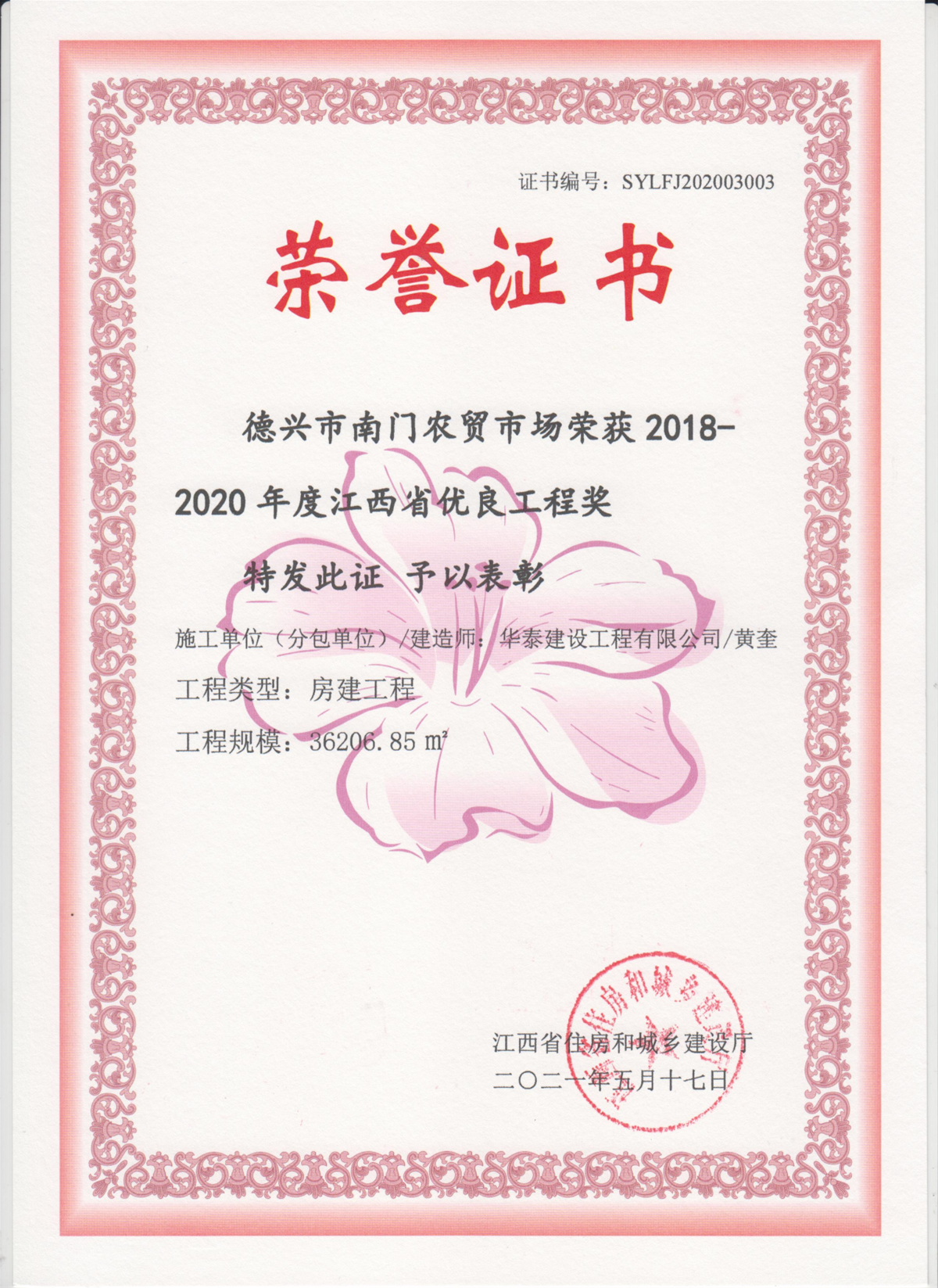 荣获2018-2020年度江西省优良工程奖 ——德兴市南门农贸市场
