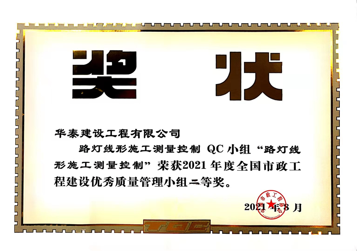 荣获2021年度全国市政工程建设优秀质量管理小组二等奖