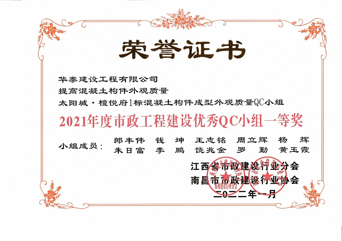 荣获2021年度江西省市政工程建设优秀QC小组一等奖(太阳城·檀悦府)